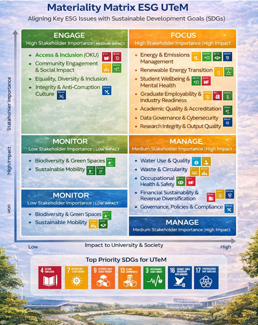 UTeM melaksanakan penilaian materialiti bagi mengenal pasti isu-isu ESG yang paling signifikan kepada universiti dan pemegang taruh seperti pelajar, staf, industri, kerajaan dan komuniti. Isu-isu utama ini diselaraskan dengan strategi kelestarian universiti yang merangkumi pengurusan alam sekitar kampus, pembangunan modal insan, penyelidikan dan inovasi teknologi hijau, serta tadbir urus institusi yang telus dan berintegriti.