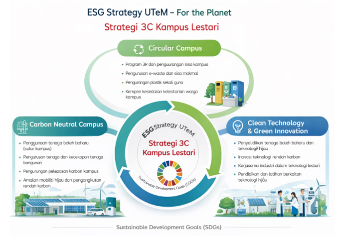 Sebagai sebuah universiti yang komited terhadap pembangunan mampan, UTeM turut mengintegrasikan prinsip Environmental, Social and Governance (ESG) dalam pengurusan institusi, operasi kampus, aktiviti penyelidikan dan penglibatan komuniti. Usaha ini termasuk pengurusan sumber secara cekap, pelaksanaan inisiatif kelestarian kampus, pembangunan modal insan serta pengukuhan tadbir urus yang telus dan berintegriti.
