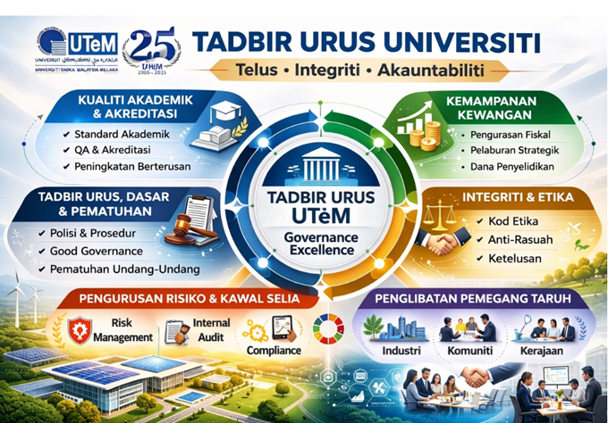 UTeM komited untuk memastikan tadbir urus institusi yang telus, berintegriti dan bertanggungjawab dalam semua aspek pentadbiran dan pengurusan universiti. Tadbir urus yang baik memastikan pengurusan risiko yang efektif, pematuhan kepada peraturan serta penglibatan aktif pemegang taruh.