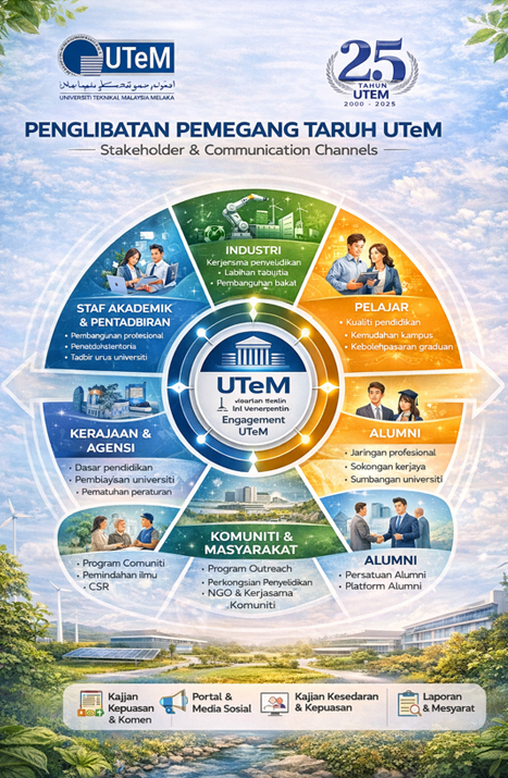 Bagi memastikan komunikasi yang berkesan dengan semua pemegang taruh, UTeM menggunakan pelbagai saluran komunikasi dan penglibatan seperti kajian kepuasan, mesyuarat dan forum, portal rasmi universiti, media sosial, laporan institusi serta program libat urus strategik. Pendekatan ini membolehkan universiti memperoleh maklum balas yang berterusan daripada pemegang taruh dan seterusnya meningkatkan ketelusan, akauntabiliti serta keberkesanan pengurusan universiti selaras dengan prinsip Environmental, Social and Governance (ESG).