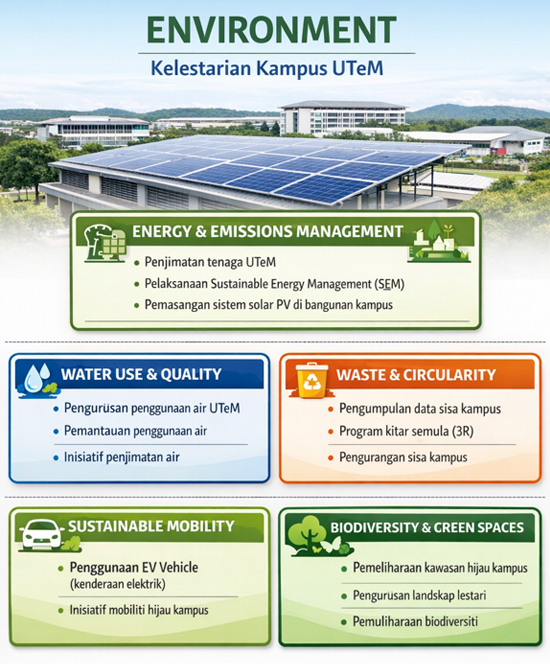 UTeM komited untuk mengurangkan impak alam sekitar melalui pengurusan sumber yang cekap, pengurangan pelepasan karbon serta pelaksanaan inisiatif kelestarian kampus. Usaha ini merangkumi pengurusan tenaga, air, sisa, mobiliti lestari serta pemeliharaan kawasan hijau kampus bagi menyokong pembangunan universiti yang mampan.