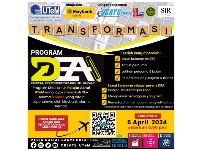 In addition, CREATE has also been selected for the Digital Entrepreneurship Asnaf (DEA) program, an initiative sponsored by Maybank Islamic through its zakat fund. The program aims to support and empower entrepreneurs from low-income households by providing training in digital and sustainable business practices. A total of 12 students has been selected to participate in the DEA program.
