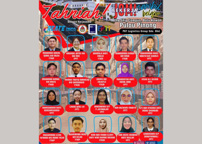 Program kerjasama antara CREATE dan PKT Logistics Group Sdn Bhd ini bertujuan untuk memberikan pengalaman bekerja di industri serta menjana pendapatan tambahan kepada pelajar khususnya dalam kalangan B40.