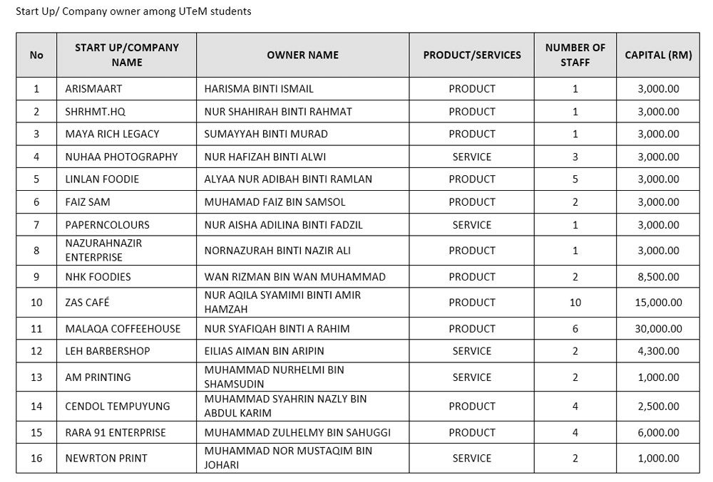 Entrepreneurship education is a cornerstone of the country’s vision for a dynamic and innovative society. It plays a pivotal role in driving economic growth, creating jobs, and fostering a more inclusive labor market-particularly for young people who are disengaged from education, employment, or training. Recognizing the urgency of these challenges, UTeM is committed to empowering local startups through comprehensive coaching and training programs, benefiting not only UTeM students but also the broader community, and helping to shape the next generation of entrepreneurs. The programs organized include