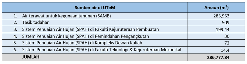 UTeM mempunyai tiga (3) tasik tadahan air bagi pengaliran sumber air hujan yang terkumpul akan dialirkan ke dalam tiga tasik tadahan iaitu Tasik Gemilang, Tasik Cemerlang dan Tasik Terbilang seperti yang ditunjukkan dalam Rajah 4.1.1 - 4.1.3. Bagi memastikan keselamatan air di tasik tadahan untuk sebarang aktiviti air, analisis makmal bagi bakteria Leptospira dilakukan secara berkala setiap tahun. Air pemuliharaan dari tasik UTeM akan dialirkan ke sungai apabila tasik mencapai kapasiti air maksimumnya. - Sistem Penuaian Air Hujan (SPAH)