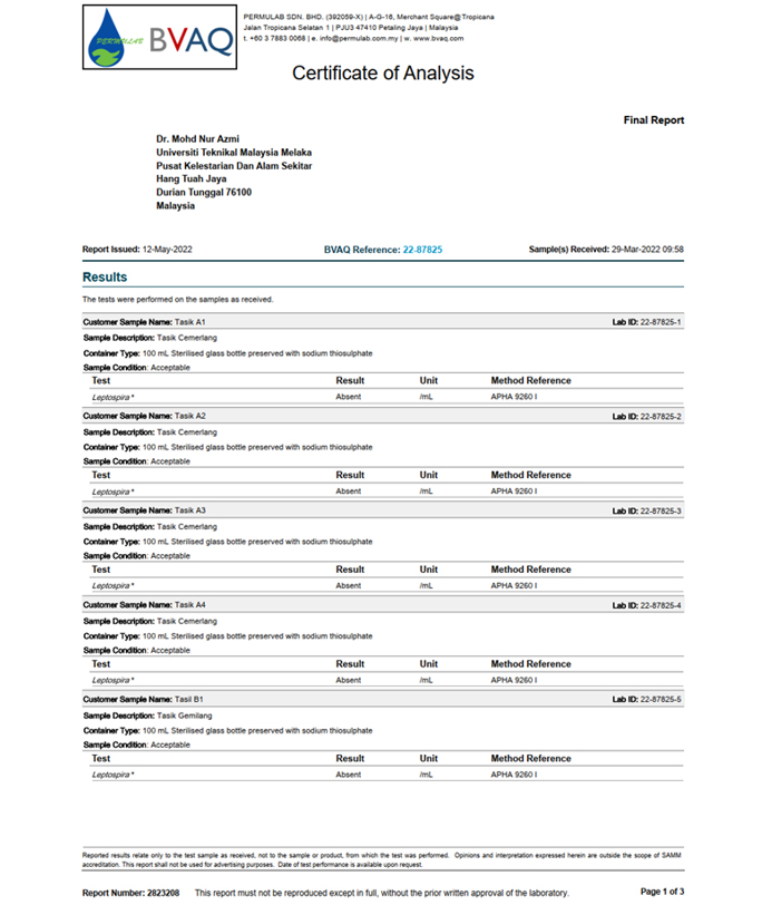 Makmal yang diperakui akan mengeluarkan laporan rasmi mengenai pengesanan bakteria Leptospira dalam sampel air. Contoh laporan ditunjukkan dalam Rajah 4.5.8. Laporan ini dipantau oleh PusatAlam Sekitar Pintar (CENSEi), UTeM. Laporan pemantauan dan penilaian dibuat secara berkala setiap 3 bulan.