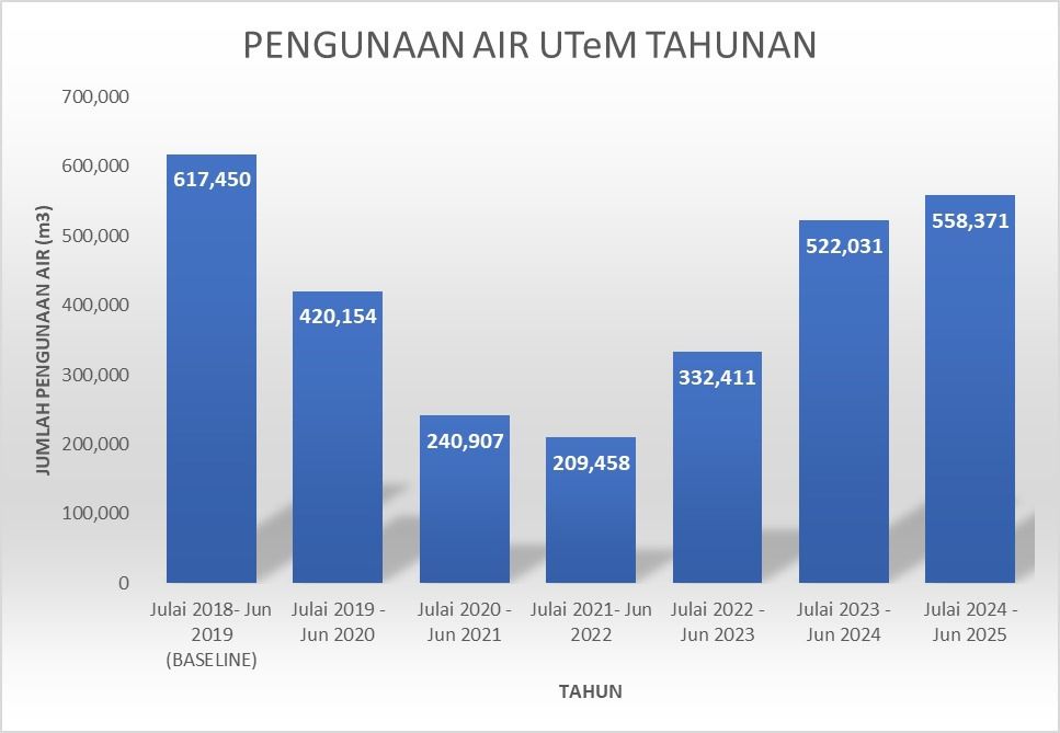 Sumber air terawat yang digunakan di UTeM dibekalkan oleh Syarikat Air Melaka Berhad. Pengunaan air direkodkan pada setiap bulan bermula tahun 2019 sehingga kini. Pengunaan air pada setiap bulan akan dianalisa dan dibentangkan didalam mesyuarat jabatan bagi memastikan pengunaan air oleh warga UTeM terkawal. Rajah dibawah menunjukkan pengunaan air di UTeM yang telah direkodkan. Line merah pada graf tersebut merupakan bacaan jumlah pengunaan air secara bulanan pada tahun 2019 dan ia dijadikan sebagai titik pembandingan pengunaan air.