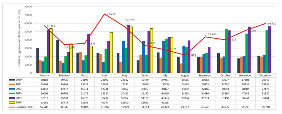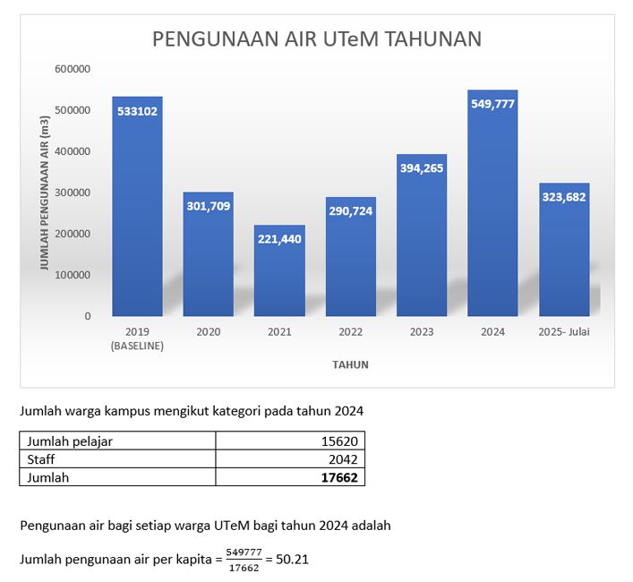 Perbandingan ini menunjukkan bahawa UTeM mengamalkan penggunaan air yang sangat efisien, jauh di bawah paras penggunaan air purata nasional dan saranan WHO. Hal ini mencerminkan keberkesanan langkah penjimatan air serta kesedaran tinggi dalam kalangan warga kampus terhadap penggunaan sumber air secara lestari.