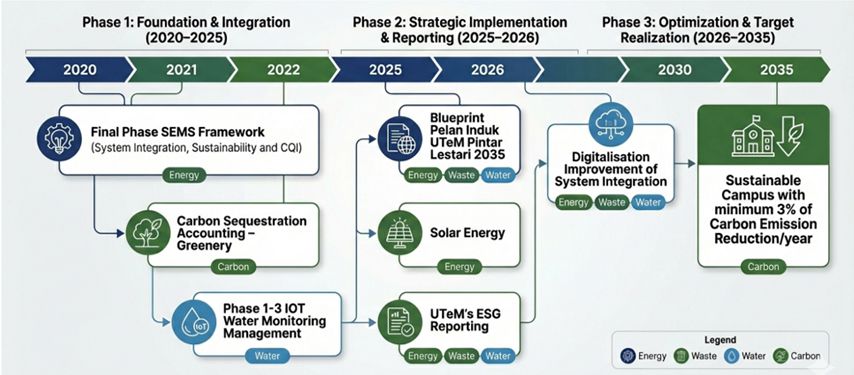 Fasa 1 (2020–2025) menumpukan kepada pembentukan asas melalui pelaksanaan fasa akhir kerangka Sustainble Energy Management System (SEMS), pelaksanaan pengiraan kehijauan, serta pemasangan pemantauan air berasaskan IoT bagi memperkukuh keupayaan sistem dan integrasi data. Memasuki Fasa 2 (2025–2026), tumpuan beralih kepada pelaksanaan strategik dengan penggubalan Blueprint Pelan Induk UTeM Pintar Lestari 2035, peluasan penggunaan tenaga solar, serta pelaporan ESG yang komprehensif merangkumi tenaga, sisa dan air.