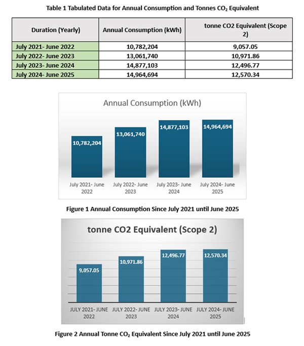 Fig. 1 and Fig. 2 illustrates the trend of annual energy consumption (kWh) and corresponding Scope 2 CO₂ emissions (metric tons) over the period from July 2021 to June 2025. The key observations are as follows: