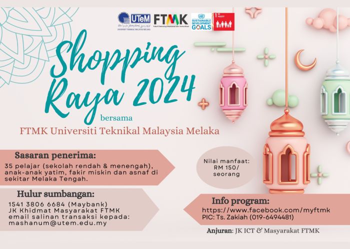 Program yang bertujuan untuk membantu membeli persiapan menyambut Hari Raya Aidilfitri untuk anak-anak yatim, fakir miskin dan asnaf di sekolah-sekolah sekitar kawasan Melaka Tengah. Program ini menyokong SDG 1 – Usaha dalam mengurangkan jurang kemiskinan di kalangan masyarakat setempat.