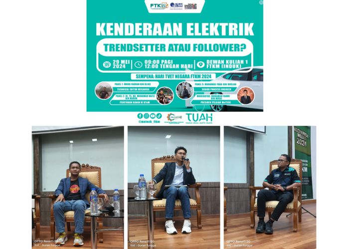 Bersempena dengan Hari TVET Negara, FTKM dengan kerjasama MeTech telah menganjurkan program forum kenderaan elektrik: TRANSETTER ATAU FOLLOWER?“ pada 29 Mei 2024 bertempat di Dewan Kuliah 1, FTKM Kampus Induk.