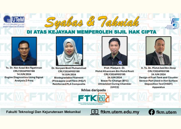 Para penyelidik FTKM yang berikut telah berjaya memperoleh sijil hak cipta daripada Perbadanan Harta Intelek Malaysia (MyIPO):
