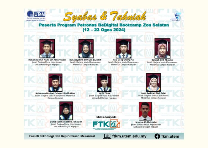 9 orang siswa/siswi FTKM telah terpilih untuk menyertai program Petronas BeDigital Bootcamp Zon Selatan. Program ini akan diadakan pada 12-23 Ogos 2024 dengan melibatkan 100 pelajar tahun akhir dari UTeM, UTHM, UiTM Cawangan Johor, UTM dan UMEL. Melalui program ini, para peserta akan ditawarkan peluang kerjaya di Petronas jika menunjukkan pencapaian prestasi yang ditetapkan.