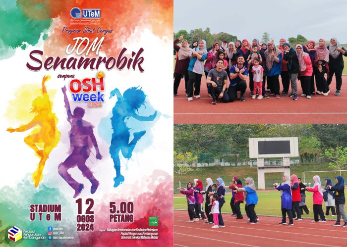 OSH WEEK tahun 2024 menganjurkan pelbagai aktiviti termasuk pengisian aktiviti kecergasan. Aktiviti senamrobik ini merupakan antara inisiatif untuk membudayakan gaya hidup sihat dan selamat dalam kalangan Keluarga UTeM. Selamat dan Sihat untuk Semua, Keluarga UTeM Bersama.