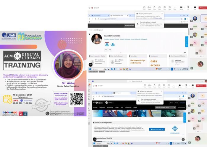 Program "ACM Digital Library Training 2024" oleh Perpustakaan Laman Hikmah, UTeM, bertujuan memperkenalkan dan mempromosikan penggunaan perpustakaan digital ACM kepada pensyarah, pelajar, dan penyelidik di UTeM. Program ini menyediakan sesi latihan komprehensif untuk membantu pengguna memahami dan memanfaatkan sepenuhnya sumber-sumber di ACM Digital Library, yang merupakan perpustakaan digital terkemuka dalam bidang pengkomputeran dan teknologi maklumat.